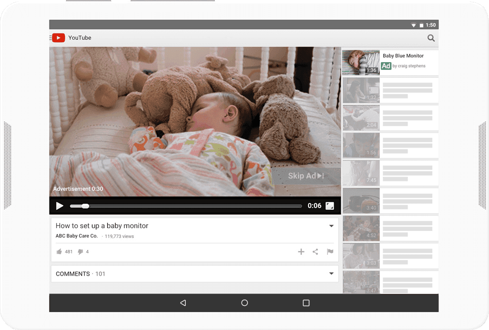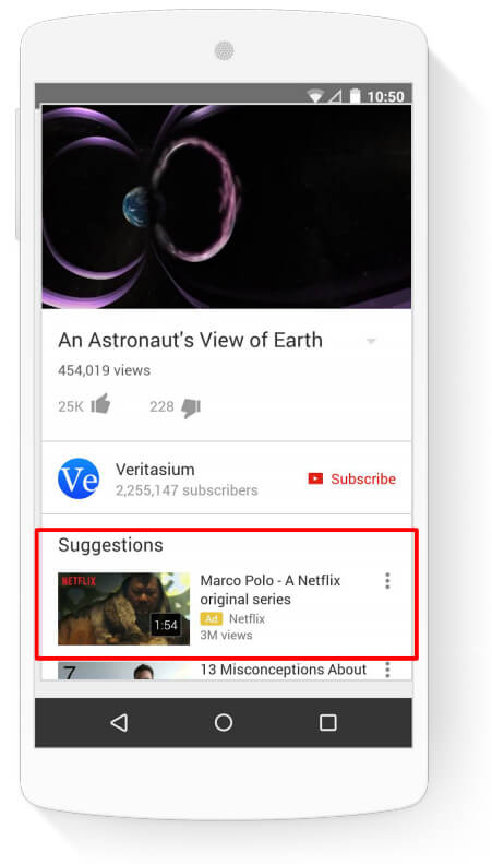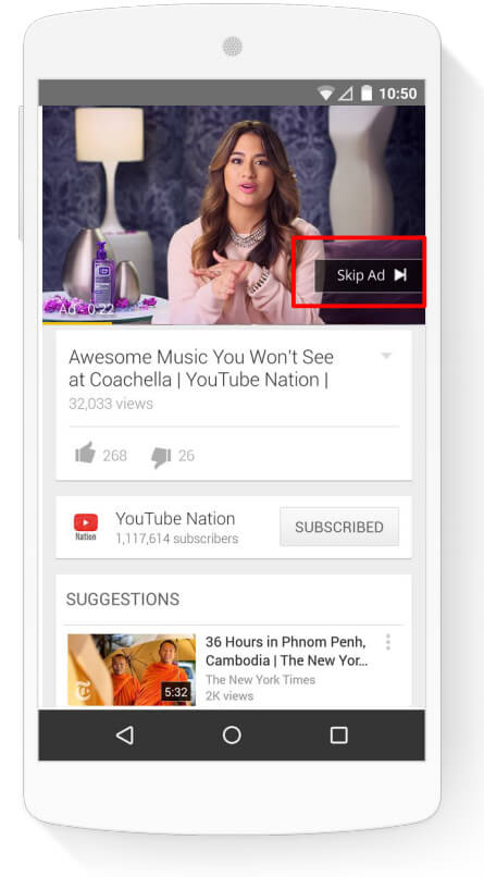 ● 在用户观看 TrueView 插播广告、TrueView 发现广告和普通视频时展示在视频开始播放时立即显示,并可由观看者关闭。